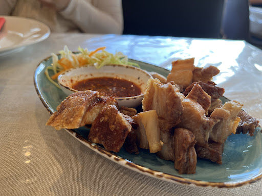 Pork belly tod - $13 - daylight robbery. This was the most exciting dish we wanted to try because of how well the picture looked! Sadly, it was bland, very oily, some pieces were tough and over cooked, others far too chewy. The skin was not crunchy and crispy, and the pork still had the hair on the skin when it was cooked. This was not fresh and we could tell instantly it was over cooked and reheated from a previous serving in a microwave. You can try and drown this in spicy sauce that’s provided - but that had no effect on improving the pork. The picture certainly does not match what was presented, and this was a HUGE disappointment. Order at your own risk but save your $13 and instead go to Panda Kitchen across the way if you’re after good pork.