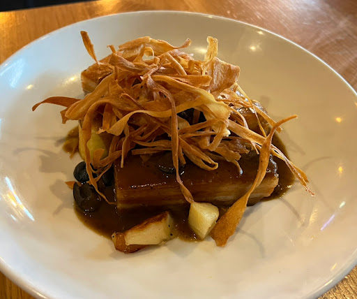 Smashing cocktails! The cherry sour was Devine 🍒- $19.50 ea but I just had to have two! I had it without sugar syrup and it was silky smooth yet brightly piquant. The food was just OK - the pork belly was the best dish we sampled with lots of meat and a beautiful balance of flavours but the skin wasn’t crispy and the fat wasn’t rendered off enough to my liking. The scallops were disappointing - the scallop flavour was suspiciously strong and pungent as opposed to subtle and the profile was more salty and oily than light and slightly sweet. The bao were also a bit underwhelming - not bad overall but the karaage batter could have been crispier, darker, more flavourful and there weren’t enough pickled elements to balance the sweet bun and creamy mayo. I prefer a bit of spice, crunch and vinegar - they were bland. The service was absolutely five star 🤌 Our wait person was so attentive, professional and kind. It’s a great atmosphere with beautiful architectural features - if a little cramped. All round great spot to spend a cheeky afternoon...