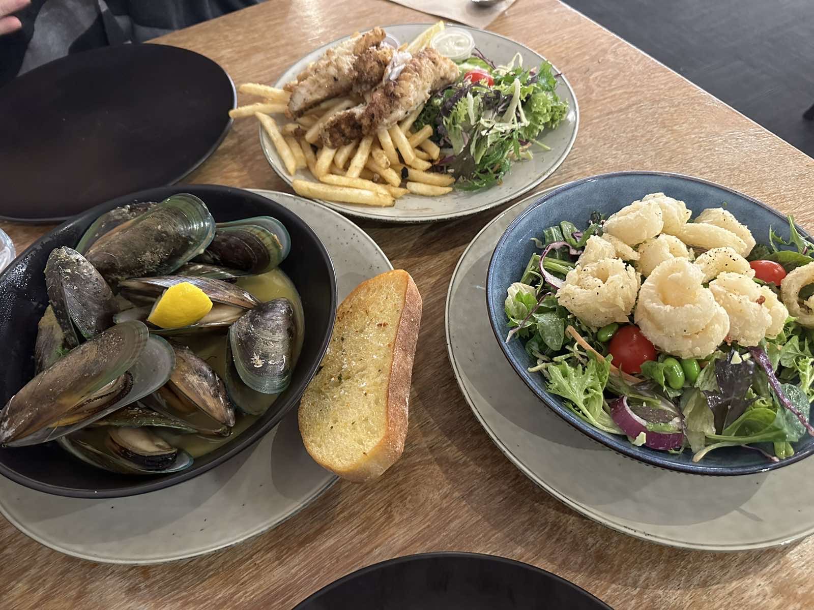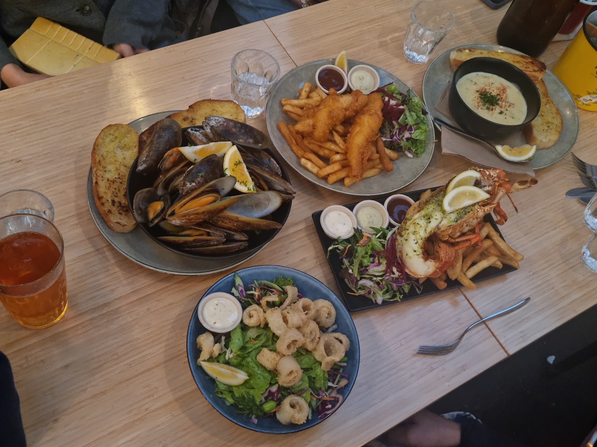 Read moreOpen on Boxing Day. Very crowded, around a 45 minute wait on peak timings. The staff were pleasant and kind. Clam Chowder Soup was delicious and had substantial clams in size and quantity. The garlic breads were delicious and fragrant. Half a Crayfish was enough for 5 people, and the meat was firm and juicy, and in the lemon juice and butter was amazing. Fish and Chips were light and crispy, though a bit small in portion for a single person, with fries taking a majority. The Calamari Salad was delicious, crispy calamari and a sour and fresh salad that cut through the heavy stuff in the meal. The 1kg Large portion of Oysters in White wine was delicious, with the sauce being so salty but pairing well with the oysters. Overall, I would highly recommend this place for a night out...