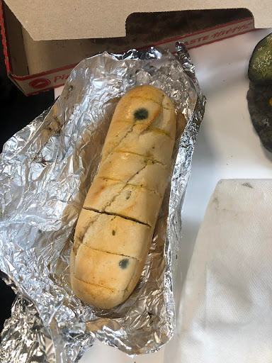 Worst part was, the garlic bread was mouldy - picture attached. When my colleague took it back, she was confronted by all 3 employees, before they cooked FOUR new garlic breads, with each single one being mouldy, which clearly speaks to their health code. They also refused a full refund, and would not acknowledge that I had been overcharged in the first place.