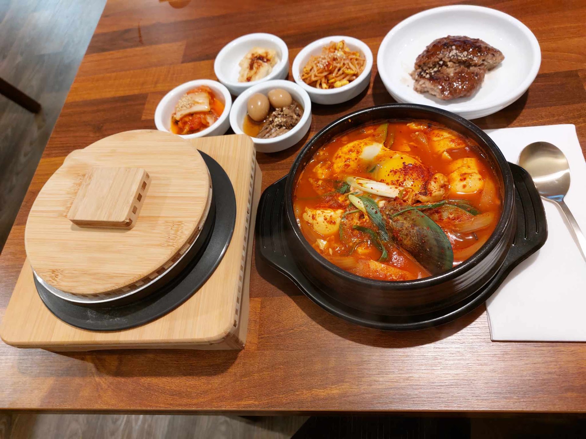 Sot Bap gets served to you in the metal pot, with a wooden base and a lid covering the rice. They will give you a seperate bowl to dish your rice out into. The pot will have rice stuck to the sides. This is called Nurunji (scorched rice). The server will come over and ask if you want hot water poured into the rice pot. Once poured, cover with the lid and let it sit as you enjoy your meal. Nearing the end of our meal, take the lid off and viola, you have Sungnyung (scorched rice tea). This is a very traditional way to enjoy rice and it's great to see a restaurant in Auckland do this!