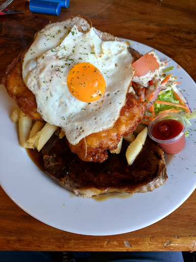 Lunch on a Saturday, 4 of us. The place is a bit dated, sports bar with TAB in the main bar, its kind of old blokes and not looking like somewhere a young family would take their kids for lunch or dinner. We had Chicken Parma, Pork Chop and Toasted Sandwich. The serves were extremely generous, gigantic even. Toasties were good, chicken Parma was good. Pork Chop is advertised as 300gm... really??? 1/4 of it is rind and bone. Pork Chop overcooked and dry. Imagine removing thd rind and making crackling out of it ? That...