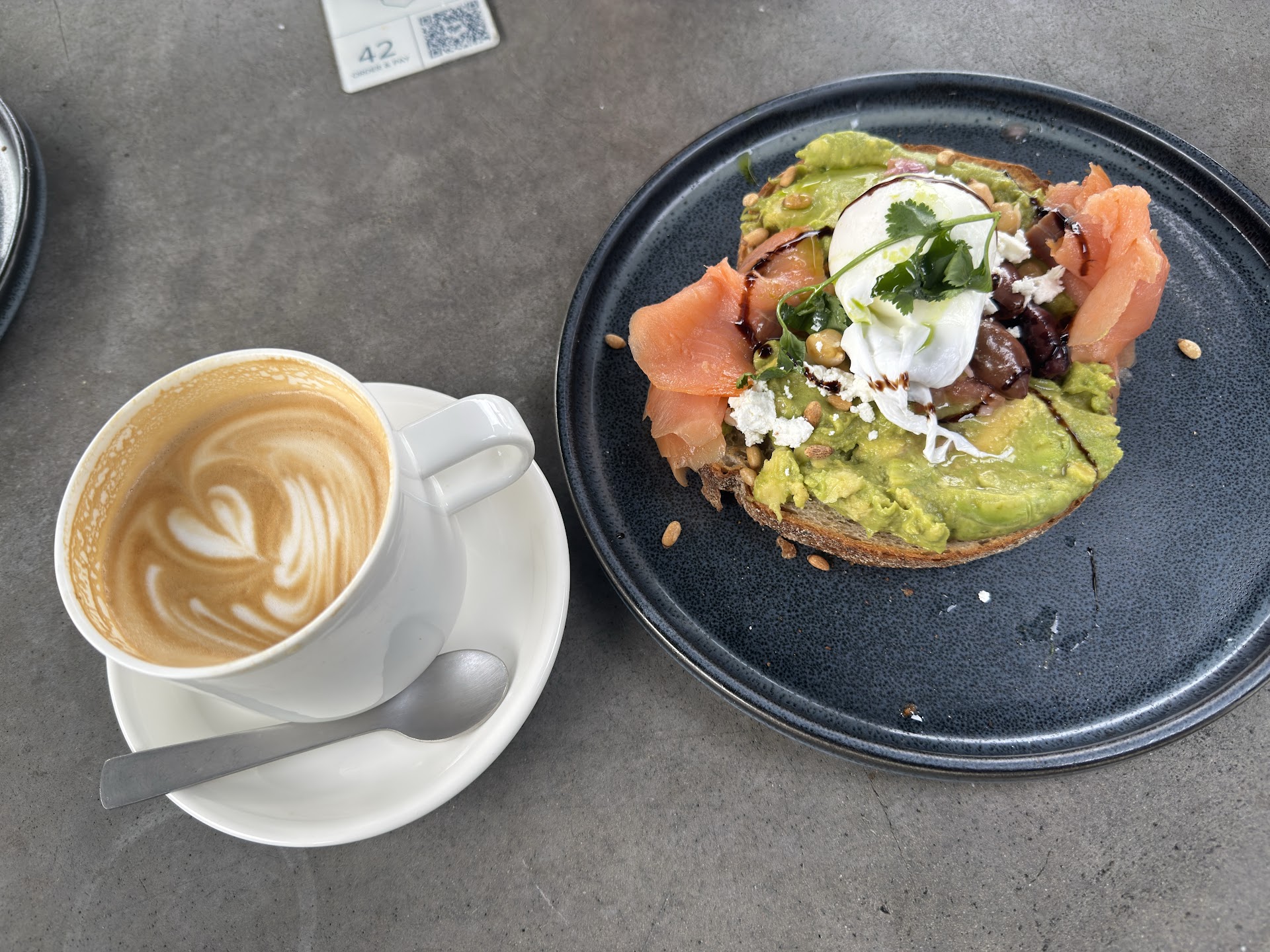 Negatives: Not value for money. I ordered the Salmon wrap (the description on the menu made it sound pretty good). It ended up being half a panini wrap where some of the wrapping paper of the wrap got stuck to my panini so had to manually rip that off. The taste was above average and all this cost $14! My wife ordered the pork belly benedict with the normal serving size. When it arrived, the presentation and the portion size was underwhelming (this costs ~$24!). The bread the pouched egg was on tasted very "airy" and felt like you didn't eat anything. The pork belly however tasted pretty good and was well seasoned and cooked. The venue was very loud. Because the entire place is wrapped around glass walls, and there were a lot of seats/tables circling around the entire place, the sound of people's conversations would bounce back and be trapped inside. It made the entire place very loud and quite uncomfortable. If you wanted a quiet place to relax, catch up with a friend, I wouldn't recommend this location. You would be better off getting a coffee and a snack from this location and sit outside on the grass.
