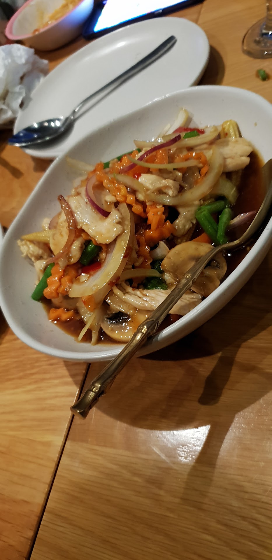 New extended menu with more ethnic Thai dishes. Large portions for an upmarket restaurant. Friendly and Attentive customer service. Relaxed home-like atmosphere. Very spacious restaurant – great for large work parties, banquets and gatherings. Interior decorations and framed pictures provide a great immersive experience.
