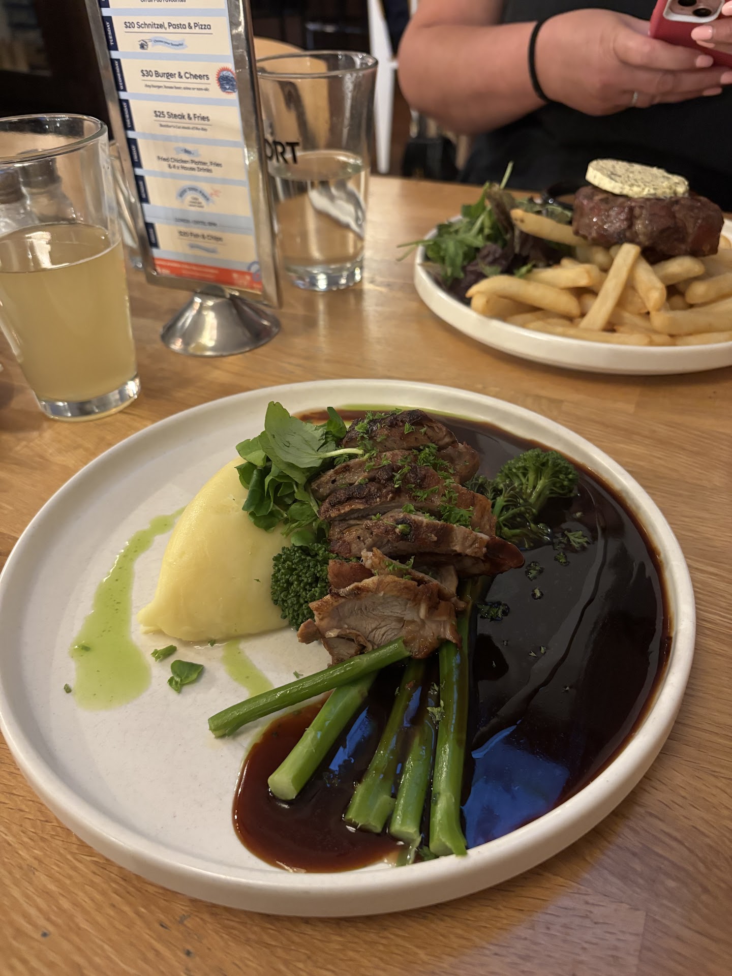 I won't waste my money or time dining here. We waited quite some time for our order, which was surprising as it did not seem like the dining area was busy at all. We were happy to wait, as normally, a good meal takes a little longer to prep, right? Wrong! Not here. We ordered chicken schnitzel with chips and gravy. The schnitzel was pretty big to be fair, however what's the point of serving a big schnitzel, but has no flavor at all and the meat seems and does not even taste like chicken. Salt and pepper couldn't even rescue it! Horrible! Well,at least we could hopefully fill up on our chips and gravy, so we thought. Wrong again! Chips was okay, however the gravy looked like dirty dishwater with added rosemary to hide whatever else was in this watery concoction! They were very generous to add some cabbage salad which was also not edible as it seems whoever cooked this meal and put this slaw together, had not the slightest inclination of what to add to make it at least even just a little bit tasty. Needless to say, we paid almost $70 for 2 plates of food we left behind almost untouched! We weren't asked why we left the food. So for that, the service is also not great. I would say, people are going there to drink and mingle only, unless you get sozzled on booze, there's no way you would enjoy their food. I do not recommend. Add a few more dollars and dine out at a restaurant/bar where you will actually be served a decent...