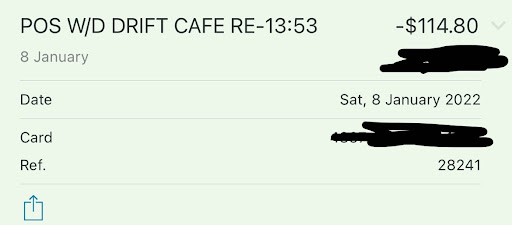 1 x Drift homemade whole loaf = $12 2 x Drift cheese burgers & fries which were $15 each from the lunch menu = $30 1 x Fishermans Plate = $34.90 1 x Chicken & Brie burger with fries = $22.20 and 3 x lemon lime and bitters $5 each = $15