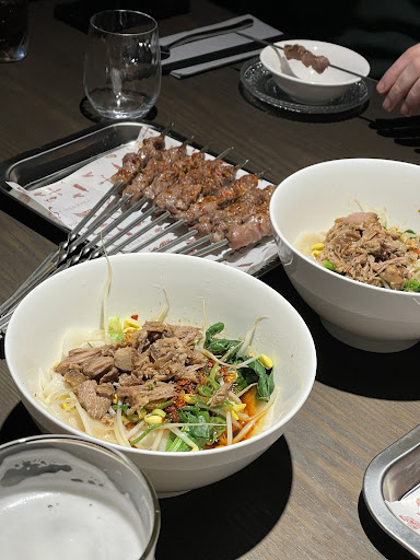 Our first time dining here, when we booked a table for 8, they didn't tell us we were booked for an upstairs room. We had a person in our group that had great difficulty getting up the stairs. They did say we could sit in the courtyard, but we didn't want that either...as it was a cold night, raining, and a breeze running through. The waiting staff were attentive at first, but after the meals were brought out, it was difficult to get service again. We reordered about 3-4 times for drinks, and 3 more times for more mains. The food was tasty, we tried new dishes...our favourites were the starters. We shared the BBQ selection of lamb, beef tendons, and tripe skewers, definitely all three were tender and delicious. Also the pancakes, they were tasty, like mini pizzas. We ordered dishes that typically are not in the regular Chinese restaurants. Majority dishes we enjoyed, like Brisket and tomato stew, Eggplant and beans (our favourite, we reordered this one again), Hand pulled noodles with brisket, two wide extremely long noodles (reordered again). A good drinks menu, I had a coconut milk, served chilled and was simply refreshing... reordered another one much later. We also had beers, cider, coke zero, and pomegranate juice. Overall we had an enjoyable experience. But communications, and service could be...