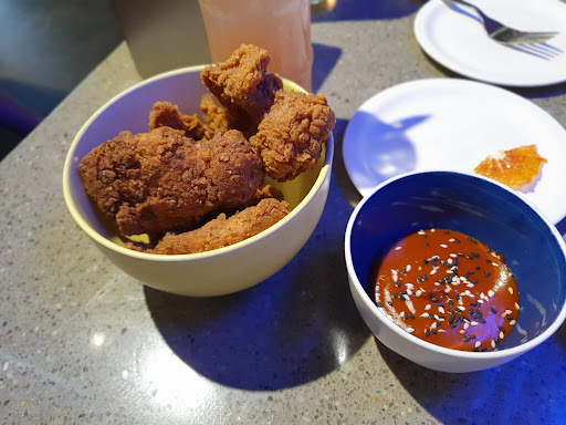 As for the food, we ordered way to much, multiple bao buns, rice cake noodles, cauliflower, wontons, and the amazing fried chicken of which we had the black garlic, and the gojuchang with mango honey. Everything was delicious, but our favorites were the pulled pork bao, the rice cake noodles, and both of the fried chicken flavors we ordered which we had to make our last bites. Luckily we have some leftovers to eat tomorrow! Thank you Dave...