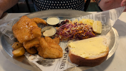 Read the reviews here on Google Reviews and was just as described. This is a new updated restaurant a great addition to the town. The highlight was the nostalgic old school fish and chips- served on a metal tray lined with a piece of paper (designed to look like vintage newspaper), accompanied with a slice of soft bread and butter, coleslaw, sweet condensed milk dipping sauce and the usual fish and chips tangy white sauce. The dish was perfectly battered and fried and was not oily or heavy. The restaurant Interior decor is simple, tastefully done with a nod to the Art Deco architecture. Walls are adorned with photos, pictures and a painting related to the locations history and fishing community. The manager is super lovely and shared very informative stories about the venue, staff are friendly and other dishes we tried (a raw fish starter and Kirkpatrick oysters) were also delicious. Will...