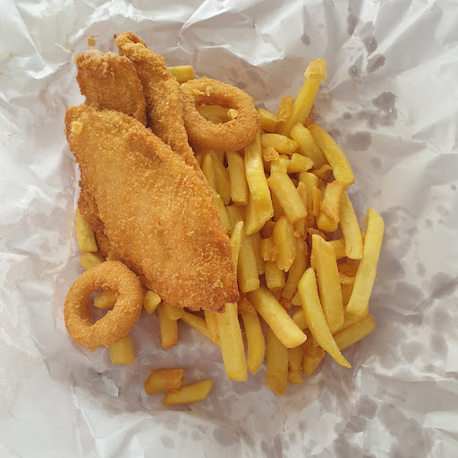 Totally overpriced rip-off !! - paid $13.50 for a “large” portion!!. For that expected 1 or 2 fat juicy pieces. Got 1 dry chewy piece, Was very flat and thin so hardly any fish compared to the crumb coating. The chips were average but sort of edible. This is the place on the mall side of the road. (There is similar named place across road just close to the vet.) Avoid this one!