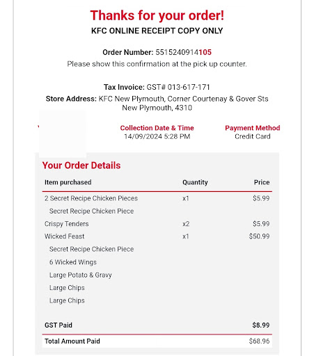 They either need to employ persons who can stay on check-out, and help with ordering on those stupid order machines. It took forever to get my meal, that wasn't correct and cold, as the case with others. I sat in the driveway of KFC for about 15mins + as did others who could not get past a car whom were blocking the way. No one was in front of these people who could have moved. Then what a mission to find a car park!!! This was not in a rush hour either. I will not be going there again. Apartently your phone or internet orders get the same treatment!! As this lady was certainly not happy and the wait she had, well and truly an hour + wait, on top of trying to get into KFC to recieve her order. This lady arrived after me and left just before me. Like her I had been up to the counter twice to see where my order was. So what is that telling you!! Seriously they need to sort these issues out big time. Not a happy camper when it comes to KFC in New Plymouth...