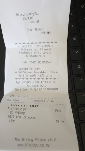 It gets extremely busy as it's the only KFC in the lower Hutt Valley. They also don't have nearly enough staff working to keep up with demand. Expect your order to take a long time. Don't even bother with the drive-thru, it often floods out onto the street and around the corner.