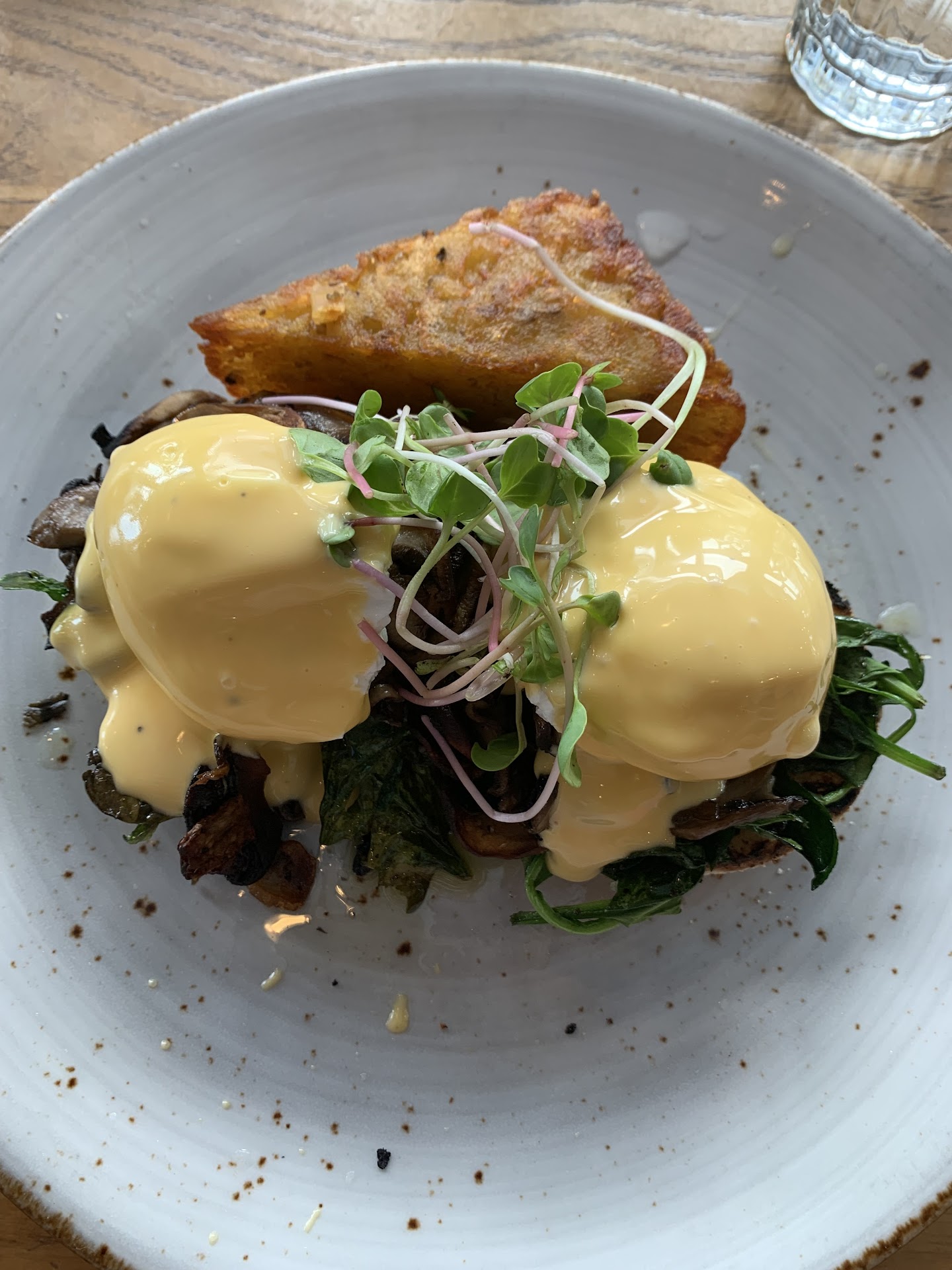 I ordered a flat white and meal with potato rosti, poached eggs, spinach and mushroom on half a muffin.