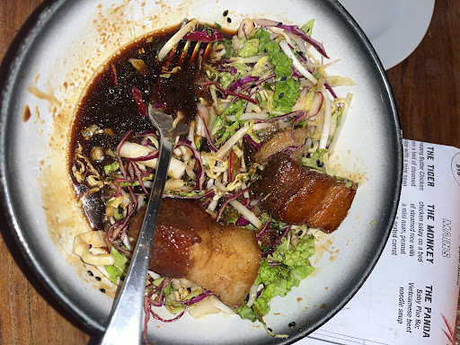 Monsoon Poon, with its reputation for serving Southeast Asian-inspired cuisine, provided a memorable evening for our group of seven. The restaurant's ambiance is a definite highlight. The red-toned decor, subdued lighting, and bustling open kitchen with its happy, busy staff create a vibrant and inviting atmosphere. It's a space that feels both intimate and energetic. My one minor critique is the persistent cold draft from the front door, which was a bit of a nuisance on a chilly evening.