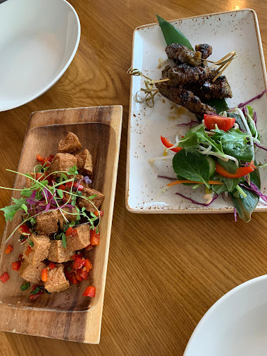We were really looking forward to this place and told the food was what Monsoon Poon was like in their hay day, so the exceptions were high. On arrival, we were greeted by the waitress and then shown our table, the atmosphere was cosy and quiet with excellent views. Was shown the menus but not told the specials until we were ready to order. We ordered two entrees, the crispy tofu and the beef skewers, for the mains we ordered the Teriyaki Angus rib eye, Grilled salmon, a roti and lotus chips. 30mins after ordering our entrees they arrived finally. We did notice other people that ordered after us got their food before us. Another 40mins later our mains were finally here.