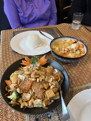 The satay chicken was very dissapointing as it is one of my favourite dishes it was way too sweet and the penuts where very hard and were a bit hard to bite. The chicken wings were over cooked and were dry but the prawn spring rolls were the better one out of our 3 entrees. After our entrees, came the mains; Tom Yum prawn was also very sweet and thick which made it taste unpleasent. The Beef salad was decent but was missing a little bit of citris taste. The Taramind duck was again sweet but it was a lot better than some of our other mains. The Hor Mok Talay was very weird it was served in a ball of tin foil so we had to open it our selves which was very hard as it was on a hot dish and the food inside was very hot the fish inside crumbled up and was very hard to pick up and also the vegtables inside were overcooked and basically became mush. The Pad thai was definently the best dish out of our dinner but it had way to many penuts and also it had alot of whole penuts. also rice protions were tiny. and getting extra rice was around $4. Overall it was a very mid experiance but the waiters were nice and made us feel welcomed but the food was dissapointing and could have been...