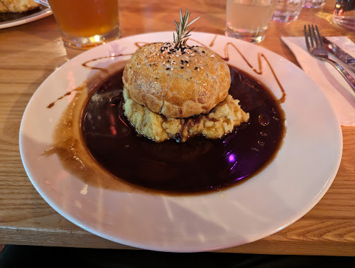 On the corner of eastern CBD Courtenay place. Could have been a great place when new. Now virtually a down market sports drinking bar with internet computer young persons monotonous music playing as back ground music. Not relaxing restaurant music. Some Seating and dƩcor on the inside has just been renewed with high tavern style wooden chairs and lean on and high tables. Outside tired and seating well used which needs renewing. Outside footpath tables with low seats which need to be higher for the table sizes, tables well used grease stained & unstable. Roadside area cheap long wooden tables & seating. Pigeons a problem as they roost on the underneath veranda concrete structure with droppings, & falling to the footpath & corner bar type ledge and seating. Seem happy to serve drinks only rather than food. Seems to be the trend for a lot of establishments. Beef wellington $36. Dinner menu small selection & pricey as they they do not have the decore to match such prices. As a result of equal pay and minimum living wage rising to $22 a hour for staff, main meals, entrees are on the increase with a lot around $40 plus vegetables & salads extra. Same with wine. Around $13 a glass for house wine $ 60 a bottle. Sunday brunch menu expensive with limited choices. Do not recommend the prawn cutlets, expensive 8 small prawns, by themselves dish which are Vietnam prawns or the spare ribs. Mince dish is more red kidney beans than mince on toast @ $12, poached eggs and scrambled eggs (2) only by themselves $10 expensive and not value for money. Coffee $3.50 plus, no loyalty card, a cup. Hygiene practices suspect. Staff changing frequently and not well trained in hospitality etiquite & not washing hands after patting dogs, handling money, and gather other customers empty dirty glasses around the rims & on the inside then carry on delivering meals and drinks without washing their hands. Don't mind all that and like watching blank TV screens with a beer or wine then this could be the place for you. Burgers, small size b buns expensive, bland, non tasty. Snacks also the cheapest ingrediences are used not quality ingrediences. Lunch and brunch inside one does not expect empty beer casts to be wheeled past by staff member dressed like a country tavern gardener wearing well worn jeans in the Wellington city central business district. Fridays they are pushing disco music aimed at the younger generation with the room really not big...