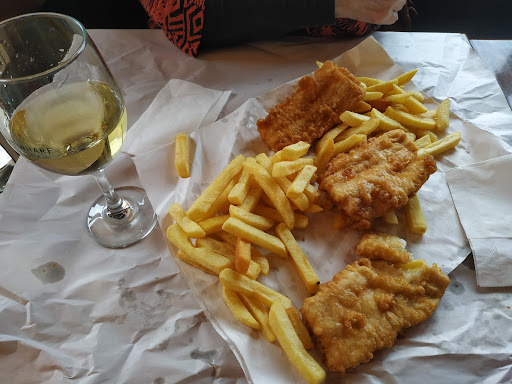 The place is very comfortable. It is closely coupled with the adjacent Thames Wholesale Fisheries. One can order fish and chips at the fisheries and take their buzzer device with you into their cafe on the wharf. When it buzzes you pick it up, wrapped in paper in the traditional way. You can buy wine in the cafe to enjoy as you eat the meal with your hands. There's a water cooler and a table with paper serviettes and cutlery if you need it.
