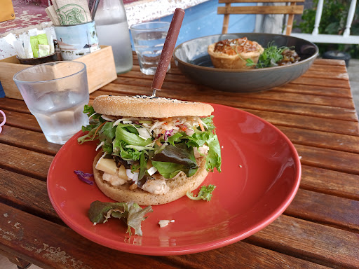 Read moreMuffummnnd ssomnup IP deallumnmpsh... gulp! Sorry mouth was full of awesomeness. I couldn't stop eating before telling you how great the chicken burger was. So juicy, not too much bun and heaps of veggies, slaw and lettuce to balance thee chicken and cheese perfectly. But wait there's MORE! Send no money now and receive a free set of steak knives. Oh wait that's terrible as seen on TV products. This is something you really do need to experience. Simply an excellent cafe with high quality food and friendly service. A bit more... It's also and organic food shop with sustainable principals. They use wash clothes instead of disposable towels in the bathroom. Fantastic stop during a road trip or if you just happen to be...