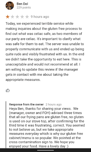 I was really excited to take my partner here last month - whenever we're traveling I love seeing what vegan cafes are around and supporting small businesses. I looked online and found a copy of their menu before we headed there; when we entered there were people waiting in two directions in front of the counter, making it look like there were two lines, so my partner and I hesitated as we didn't know where to queue from. The woman at the counter was quite curt with us, telling us to join the back of the line and pointing to one side. We lined up, and whilst I briefly looked at the options behind the glass I thought I knew what I'd order off their menu, so when we got to the front of the line and I didn't see a menu, I asked where they were - the woman was curt again, saying it was only cabinet food. This threw us a bit; and although I had read online it was a vegan cafe, some of the options in the cabinet looked pretty convincing and just said "bacon and egg butty" etc. so I asked if it was all vegan, just to make sure. The woman looked at me blankly and rudely responded "we're a vegan cafe, yes". There was really no need to talk down to me for just checking. When my partner placed his coffee order, she asked if he'd like regular milk as well, which isn't vegan, and justifies why I would ask. My partner and I were really disappointed by our experience; we felt like we were treated like a burden for spending our money here. I was especially disappointed as when I saw they sold cute merch and recipe books, I would have loved to go home with something like that if the experience had been a positive one. I saw a sign saying they were seeking staff on the way in, and working in the hospitality/tourism industry myself I understand the stress being short staffed can place on a business - but there's no need to take this out on...