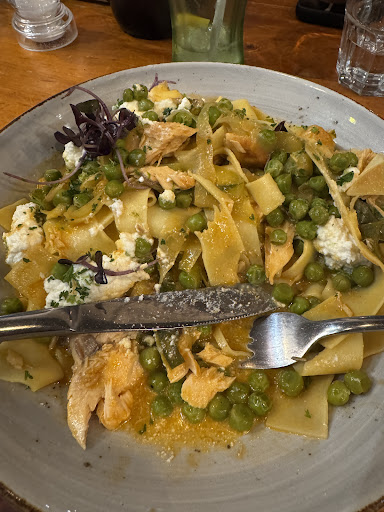 I chose what I thought would be a fresh, vibrant dish and instead I got what can only be described as reheated (and yes, I can tell that because I was a chef) slop with chunks of dry overcooked salmon (not smoked), about 300g of nuked, wrinkled peas that had started turning the appetising grey-khaki a few of us remember our grandmothers made when boiling veges to death was the done thing, a few strings of slimy “zucchini ribbons” that had had their life force cooked out, pasta that was so wet and overcooked that I didn’t need to chew. No seasoning. Floating in its own defrost-juices. And finally lumps of cold ricotta strewn on top to make it look somewhat appetising. No “summer herbs” or lemon in sight or taste. Words cannot describe how disappointing it is to hand over money for such a load of careless kitchen waste - wouldn’t surprise me if this is batched cooked, frozen and thawed for service. - from frozen or reheated- both are absolutely no-gos for These ingredients.