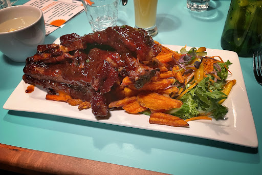 Service slow to start. Showed us to table, then 10-15 minutes til brought water over & offered drinks. I had the ribeye steak. Was tasty, but there was no room on plate, so therefore steak lay over top of half the fries. Sauce should have been in a jug, not a bowl.... which took up too much room on plate. So presentation poor; & because plate was too small it made it difficult to eat. Decor drab & dark. Needs a refresh & lighten up. Very 80's/90's. Lighting not over all tables. Price....found meals priceý; in light of fact they're pub meals. Much nicer places with the meals at same or lower prices. Now I hadn't been here in a long time, & I felt I was in a time warp. So, overall, meals good, but pricey & not overall good...