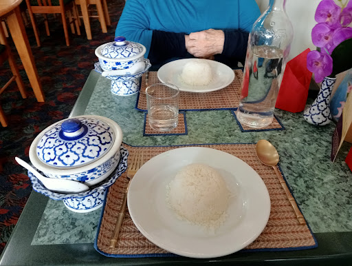 Today, my wife and I both chose Thai curries. She chose a chicken Panang, I a roast duck red curry with red grapes and pineapple. Both curries contained plentiful quantities of perfectly cooked vegetables, and were served in beautiful blue lidded bowls alongside plates of fragrant jasmine rice.