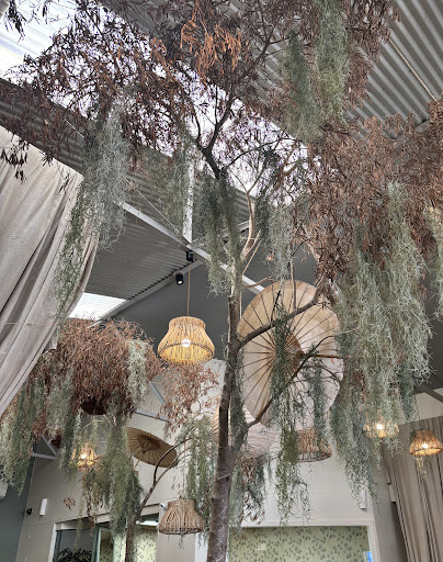 Atmosphere - it is an interesting mix of wood, different browns and greens. The interior design help separate different areas not making it feel massively big. The soft greens and browns with the tree in the middle of the room makes the room feel calm and if we were in a Vietnam forest. The seating is a range for what you prefer, couch, chair, or outdoors. Overall the menu matches the atmosphere