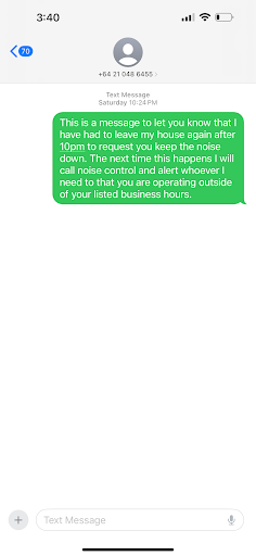 Please refrain from stating that I am having a temper tantrum as I explicitly asked your customers to be quite politely and you have refused to do anything about the previous complaint. The text message was sent at 10:24pm and it took me 1 minute to walk home so this was not “just after 10pm while you were closing”
