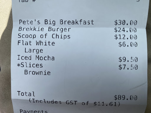 Read moreDrove from South Auckland to try this place for a birthday breakfast. Ordered two coffees, big breaky, burger and fries, and a brownie. Was surprised when bill was just shy of $90. The big breakfast was fantastic, eggs perfect, well suited toast, and in house tomato relish was the highlight of the plate. Was not too happy to find out that the breakfast burger that costed $24 didn’t even come with a patty. $10 more than the cabinet bacon and egg bun, and the main different was a potato rosti. Additionally, it didn’t even come with fries, so to order a pattyless burger and fries costed $37, which is more than most restaurants would charge for a sirloin steak and chips. The burger was okay, but nothing special. The fried however were way too oily for our liking. Coffees and brownie were superb, couldn’t have asked for better. If ever in the area I would definitely return for coffee and a treat, but I wouldn’t be too keen to use my life savings to pay for a...