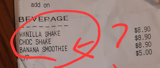 In the end, the receipt confirmed it was a "banana smoothie," even though the menu clearly said "Banana Shake" under the same category as the other milkshakes. This is really confusing and misleading for customers.