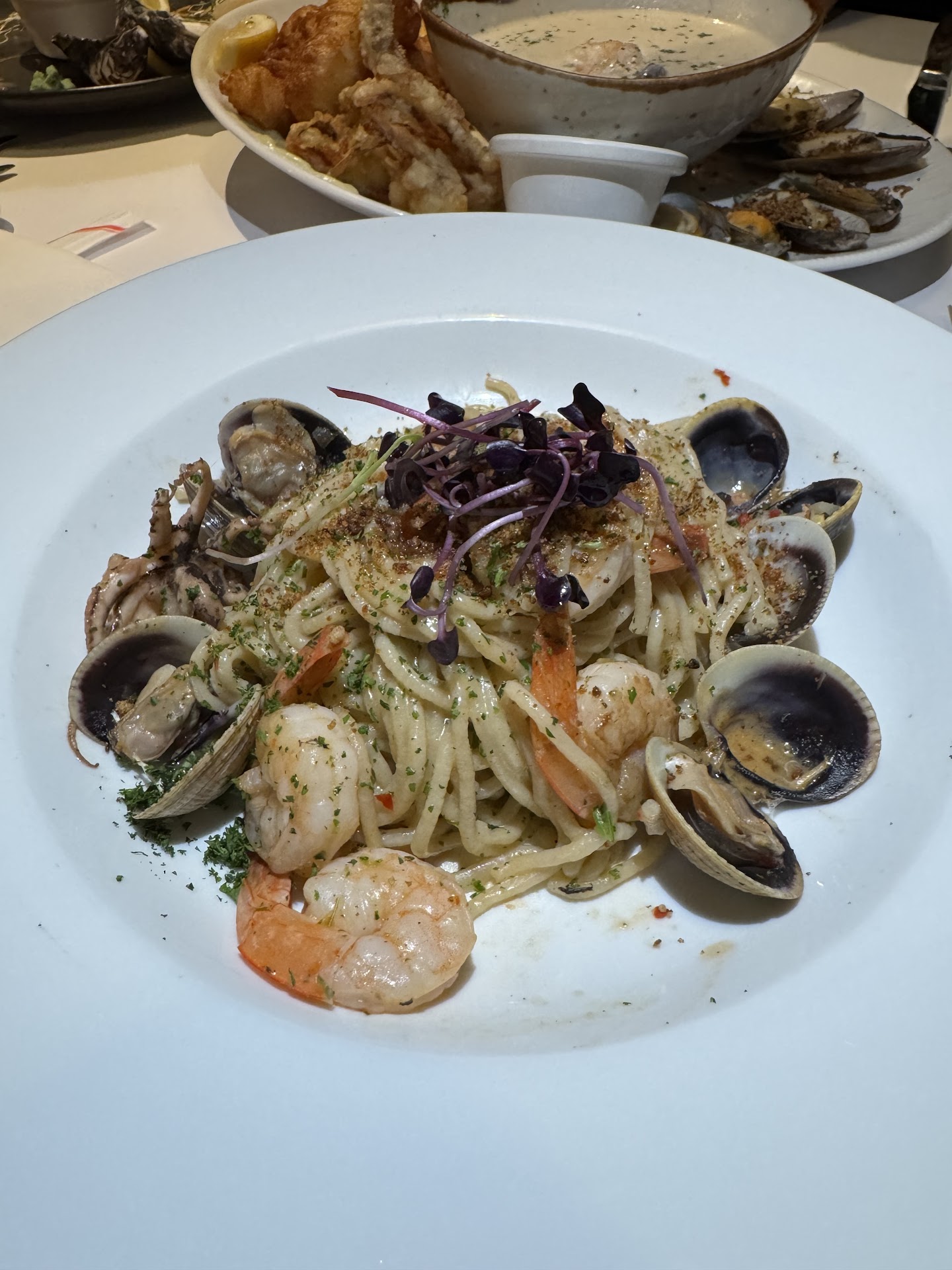 Pasta was bland and $44. Served with frozen shrimps and one baby octopus. Honestly idk how this can be a seafood restaurant with such quality. Iâve seen other reviews and their prawns look different as well. Please also mention shrimp vs prawns if youâre going to be serving shrimps.