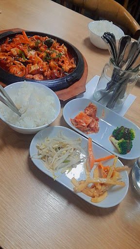 First time we have tried Korean food and most impressed. We don’t eat meat so da bit worried about our choices. However, found there were plenty of options. I had a spicy seafood dish that came with rice and side dishes of different pickles. My wife had similar but the main was a non spicy tofu with black bean sauce. Both meals huge and delicious. Service was excellent and attentive with the chef coming out to check if I was happy with the level of spice because I requested very hot and it was perfect. Decor is scrupulously clean and new...