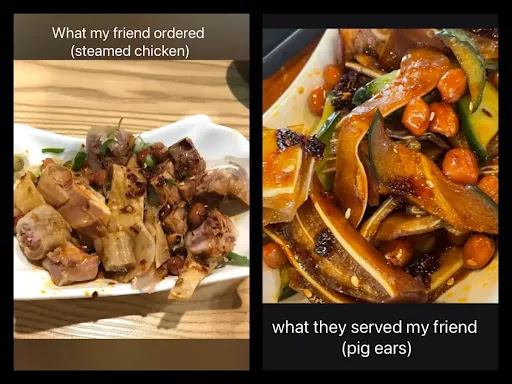 Absolutely disgusting. I had ordered a promo of $8.99 steamed chicken with chili oil. I in fact did NOT get that. I got "displayed" for whoever knows how long what seemed like PIG EARS. It was cold and utterly rubbery. In the picture (I am the friend being mentioned) is the comparison of what was supposed to be served and what I got. The whole experience went like this (from memory): I confirmed and paid for the meal, I was walking away back to the table when the staff called me back and grabbed what seemed like an "appetizer" (left photo) and thought it was for free. I brought it back to the table to my two friends and we all took a bite out of it yet before we even sniffed it, we all thought it looked odd but we thought it was an appetizer. I waited 20, nearly 30 minutes for my food and when my friends got their food, the same staff who assisted me had asked if we were all together (for some reason??) and he kept gazing at me, walked by me every 10 minutes. I then thought it was a good idea to go back to the counter for a follow up. That same staff who assisted me before looked confused as I asked for a follow up. He printed out a receipt and showed me what I purchased (as if I couldn't read). Confirming it with me that I did indeed receive my steamed chicken. We went back to my table and he CONFIDENTLY confirmed it was THAT. I apologized and sat back down. My friends looked at me and said it did not look like chicken. I refused to eat it. After awhile, as his usual visit around me, he gave our table a free bowl of soup. It looked as if he was apologizing because I wasn't eating the food I ordered at all. My friends gave me bits of their food kindly and after awhile of eating, I decided to takeaway the food to show my parents and get a confirmation of what I was eating. We left, I got home and showed the food I was supposed to eat to my parents, instead of asking me what food did I get, they said AND I QUOTE, "Why did you bring home pig ears?". PIG EARS. COLD, RUBBERY, SMELLED LIKE MOLD, PIG EARS. I am devasted. Next day, I felt so off. I kept waking up in the middle of the night and early crack of dawn nauseas and my stomach was in pain. I have gotten food poisoning previously and it was just going through the same symptoms, through the same experience etc.. I would like to get compensation and a full refund as that restaurant made me broke. Disgusting. Till this day (nearly a week later), I still feel somewhat ill. Thank yall for reading. Please take this experience into consideration....