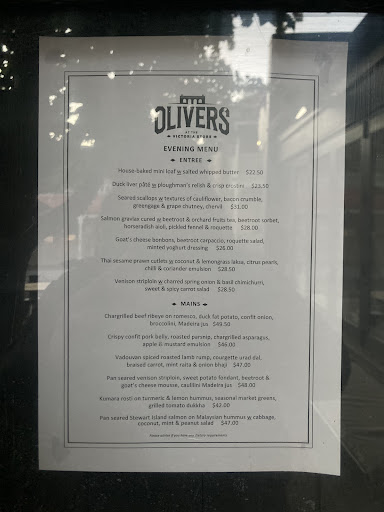 Read moreWalked in to Oliver's last eve without a booking. Was offered bar snacks from their menu. Asked if I could have it to take away ( as atmosphere was not to my liking ) and was told yes I could takeaway but they could not guarantee the quality if I did so. I agreed and ordered basic stuff that couldn't be damaged by takeaway. A mini sourdough loaf ( with long-winded butter accompaniment which I wanted to try) and shoestring fries ( with aioli - I think lemon and garlic ). Sounded yum. I waited patiently. After around 20 minutes ( not too long in my opinion) I was presented with a small closed box. I took it gratefully and left. When I got back to my accommodation I realized that I only had bread and fries in my takeaway box. The bread was good. As expected. The fries were underseasoned. And without the flavours I had paid for and expected to compliment these I felt pretty unhappy. The service was fine - although the staff seemed confused about what they can offer - but they were pleasant. But no. I do not recommend this establishment. A real...