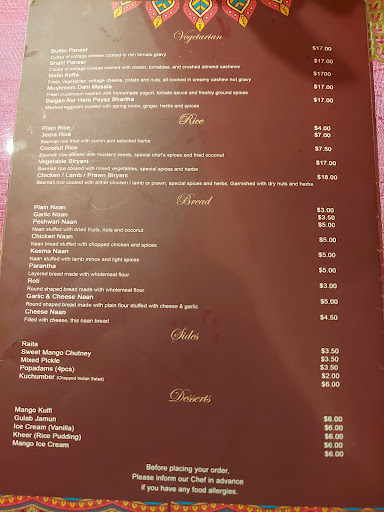 Read moreI ordered chicken chilly, chicken Tikka kebabs and lamb biryani for takeaway. It was honestly the worst preparation. The chicken was stale, the kebabs were dry and the biryani was coloured dry rice with dry lamb peices. I'm not sure how the ratings of this place is decent. Please improve the food quality is my only suggestion. I'm an Indian so I know the authenticity of indian food. I'm really disappointed. Sorry abt the bad reviews but I need to be honest for the price we pay...