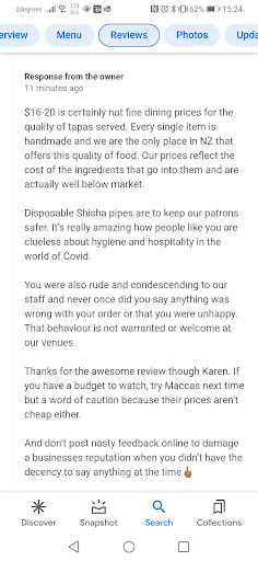 Comment: NO ONE is making a scene. The only person that can't take constructive criticism is you. Be professional! Even your comment is so immature. This is what we've experienced when we came to the restaurant so why would we fake our experience??! As for the the young manager Ive nothing against him the other thing we expected was professionalism and being clear that half of the cocktails looked nothing like the photo's on your website and also that you werent capable of making it. You can't expect people to pay that amount and expect just a fruit juice premix looking cocktail. This isn't the standard of Parnell. Don't assume that we are complaining for the sake of it we actually was very disappointed. Take the criticism...