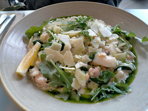 First time trying here. Had the brunch bowl and the smoked salmon and prawn risotto. The brunch bowl was very nice, love all the components. We also added $8 for the extra grilled Halloumi which completes the dish. The kumara fries and the egg was my favourite in the brunch bowl. The risotto was creamy and tasted good. I think the portion could have been more since it was not too big. Also felt it lacked some flavour but I still liked it. Service was quick and I like the ambiance of this place, spacious and bright with some green. Will definitely come back to try other things.