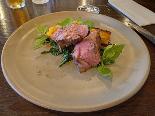 Back I went, a little before 7pm. After memorising the menu and the drinks menu - up to the end of the red wine - I ordered: A Long Island Roast rump of Lamb, touted as "medium-rare" A glass of Elephant Hill Syrah with the main And I warned my waiter that I may need a beer after the cocktail, so don't rush the meal. My waiter, Ollie, clearly knew how time worked, for the meal turned up precisely when he said it would.