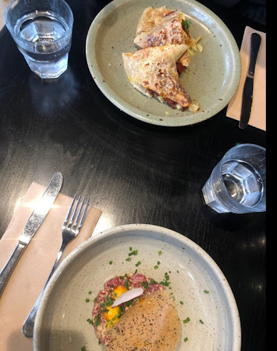We ended up trying a few dishes, and every one of them was memorable. The plate with potatoes, smoked fish, salsa verde, a fried egg, and ciabatta was comforting and satisfying. The crudo with green kiwifruit, chilli, and citrus labneh was refreshingly exciting, and the market fish dish with seasonal greens, cavolo nero, lentils, and goddess had a great mix of flavours. I even enjoyed the cinnamon brioche – it was like a cozy, sweet finish to the meal.