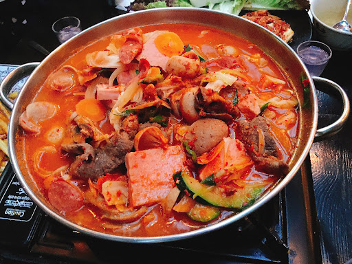 We also ordered a few other classic pub-style dishes, like tteokbokki (spicy rice cakes) and a hearty Army Stew (Budae Jjigae), which were both very satisfying and packed with flavor, complementing the rich pork belly perfectly.