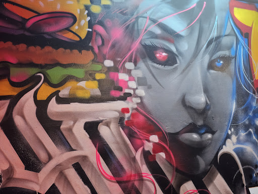 Mean atmosphere in store, indoor and outdoor heating, sick graffiti art on the walls, heaps of seating.