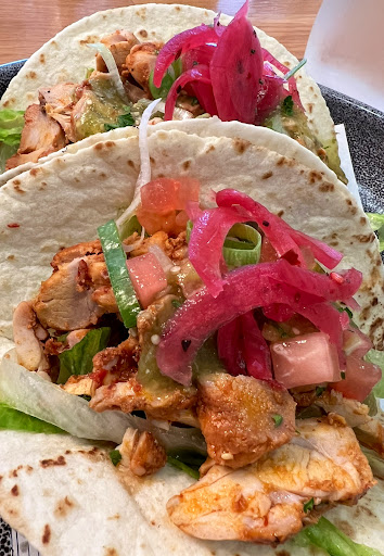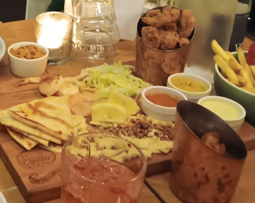 Food was a little disappointing. Ordered their only Platter on menu. Seemed Small. Contained Pita quarters (5) Didn't understand the pile of shredded lettuce ? It had heaps of hummus squid and chicken. Sauces took up most of Platter. Squid and chicken tasted like the oil was dirty and a little overdone maybe. Or it could of been the oil made it taste the same. Presentation as well as taste was low. I make better at home. I expected a lot better for price. POOR Ceasar salad was AVERAGE Pork belly tasted NICE, but serving was small boring and presentation was ok. Food looked low quality. Didn't match the Atmosphere which was awesome, music great! Although as soon as you walked into the toilet corridor you could smell urine.