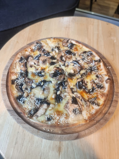 I ordered two pizzas: the Garlic Chicken pizza and the Black Truffle pizza. The first issue I noticed was with the pizza size. The size advertised on the wall was larger than what was actually served. It felt more like a kids' size pizza for the full price. Moving on to the taste, the Garlic Chicken pizza was a letdown. It had a rancid flavor, possibly due to the added sesame, which didn't taste fresh. Additionally, the garlic taste was overpowering, and the chicken had a leftover taste. On the other hand, the Black Mushroom pizza was relatively better and could be considered above average.