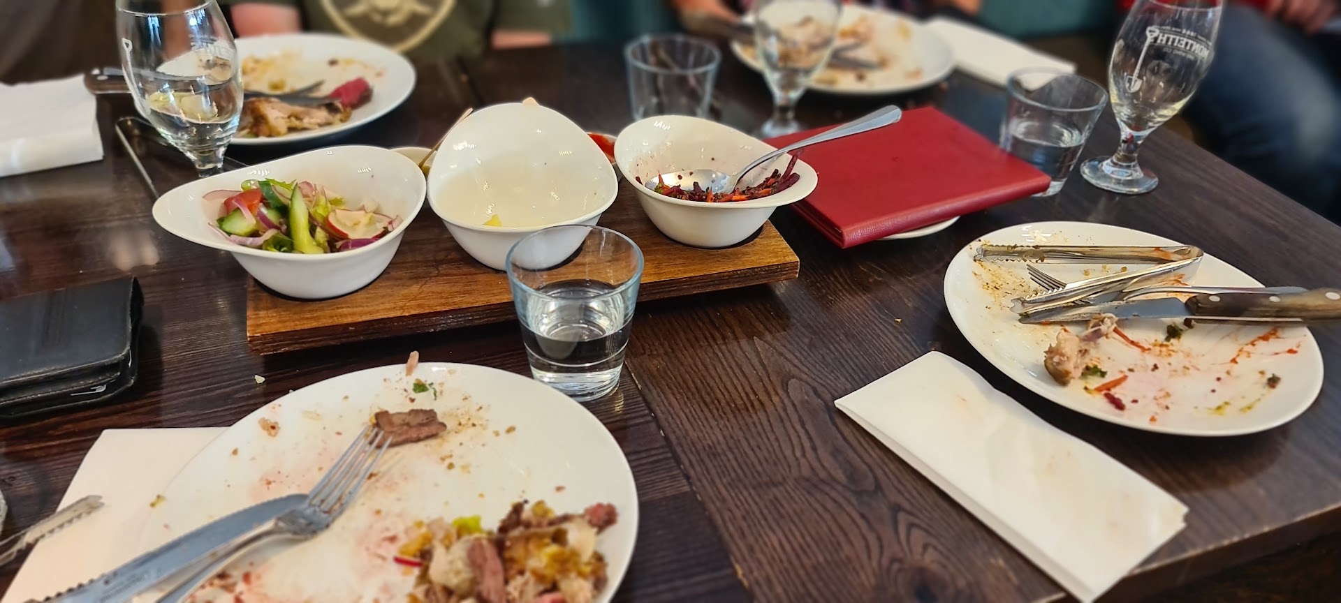 By the time we were all eating, more drinks had been ordered but they didn't arrive until were at the 1 hour 40 mark, by this time we had gone to the bar in person to order drinks, which had to be paid for on the spot as they didn't believe we were at a table but we walked off thinking they would be delivered to our table, which they weren't. It's useful to add that the person who ordered the drinks had an arm in a cast with a sling on, so he was obviously incapable of carrying a tray of drinks. So we finally got those right at the end, drank them as fast as we could and prepared to depart.