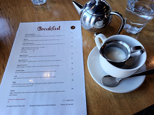 Read moreThere's parking directly opposite if you are lucky. The waiter greeted us as we walked in and took us to a table, providing menus. It was too windy today for the outside tables but there is that option. Because I wear hearing aids I struggled to hear him speak behind his mask above the chatter of the other diners. The menu had a good range of choices plus there were muffins and sandwiches in a cabinet. The teapot had an insert for the English Breakfast tea-leaves which was nice to see rather than a teabag. The iced coffee looked and tasted yummy. There was room between the tables to pull out chairs without bumping others and to walk to the Restroom which had a nice decorative accent in one corner. Plates were cleared away without us feeling rushed. Stop and admire the view of the water as you leave or wander into the historic Evans Bay boat slip next door and read the panels...