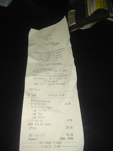 Read moreI have said it before and I will say it again. The food at all KFC outlets is pretty much the same because it is a set menu. What makes the difference is the staff! Before we go there, lets also take a quick look at promos and food presentation. Now, just putting it out there this does not reflect on the Avondale branch as a negative comment at all. It is my personal opinion on KFC overall. Talking promos, the latest being the Hot & Spicy run. This is the best thing since Zinger Burgers. The killer flavours and crunch. The tenderness of every single piece of chicken. You cannot beat it. People go mad during this promo, even the fact you are being charged an extra .30cents for each hot and spicy piece you order is overlooked. That is how popular and how good it is. So tell me. Why is the promo so short lived? Or why isn't it available all the time? Sales and the demand must set bells ringing that you are on to a winner! Plus nothing ruins a meal more than fries that are not piping hot and fresh out of the deep fryer. Don't dish out fries that have sat there and they are almost cold. Just putting it out there. Back to the staff at the Avondale Outlet. Awesome! A+ for the person taking the orders through drive-thru. Very clear, polite and informative. And the young lady handing out the orders, keep smiling that smile of yours, it really makes a difference seeing someone happy in their job. Amazing! AA+ 10/10. As always stay safe out there Peeps. Bon Appetit💓