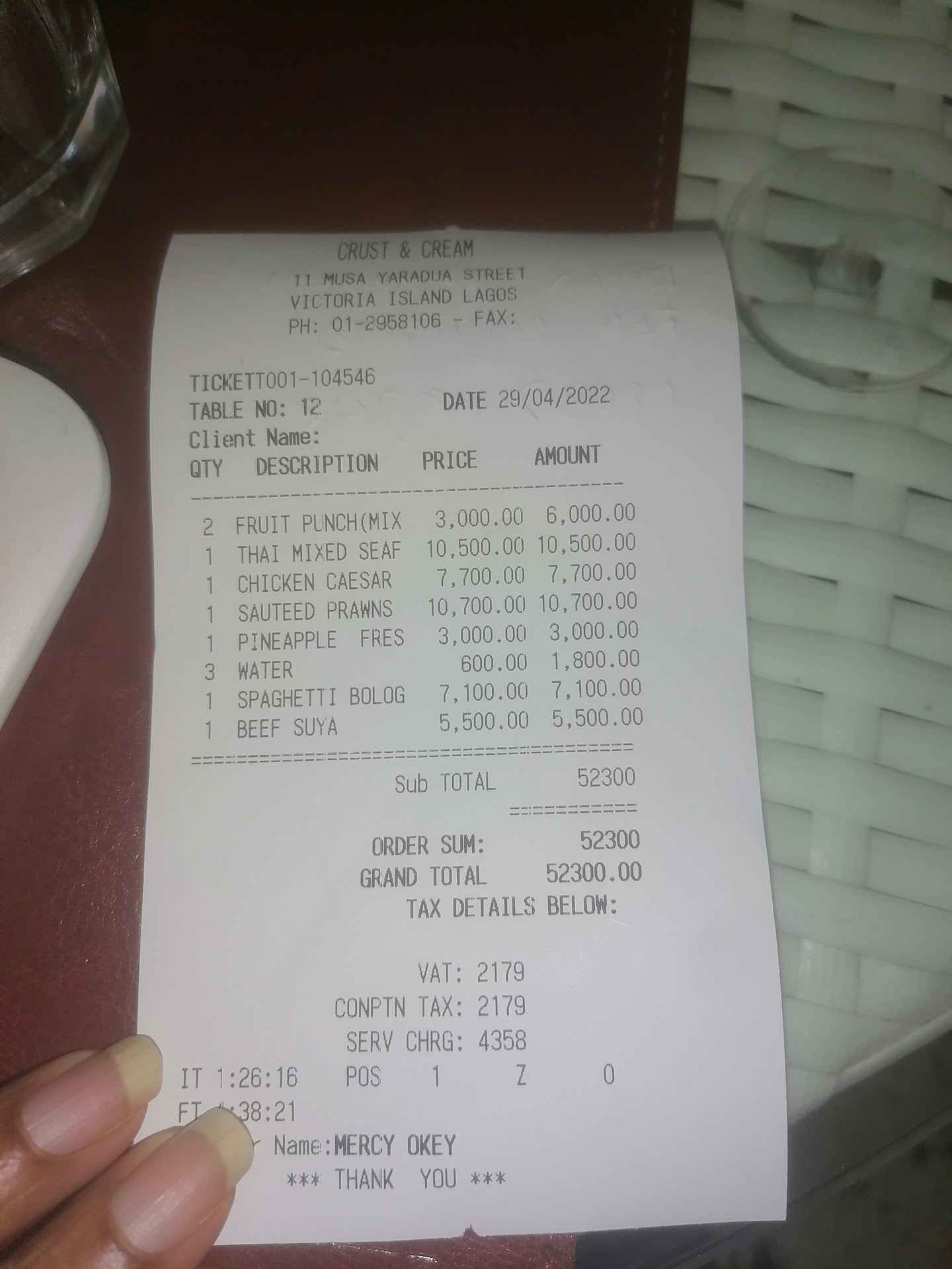 Read moreCrust and cream is my holy grail. Recently they changed the menu and the prices increased and the food quantity along with it. However, it’s still very cozy and inviting to dine in. I had the c & c club sandwich the last time I was there, it wasn’t the best most especially the cheese it tasted weird almost like it didn’t belong in the sandwich. Also got a side of shrimp which they said was grilled, it ended up being very chewy (which I didn’t expect) with a little burnt flavor to it that I didn’t mind. The house wine was 1,200 (most house wines are usually 1,500) and it tasted quite cheap. I won’t mind if the price of a glass of wine increases to get better quality. The fries are perfect and the burger too. Well seasoned. One of the best bolognese in Lagos too. Overall crust and cream would still be my go to restaurant even if they slack sometimes and they still try to make it up in...