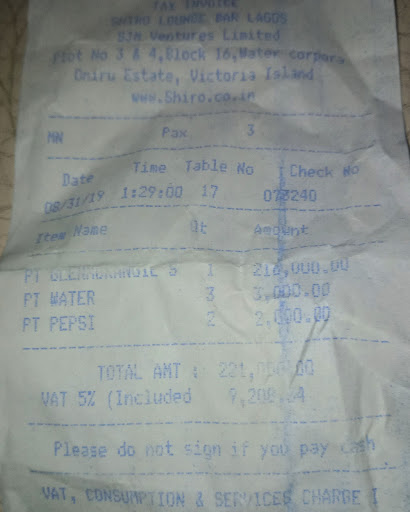 Some friends and I, finished from an event for foreigners living in Nigeria (Lagos Wing) and thought what could be a better way to end the lovely Saturday evening? We decided to go dancing. Looking up options, we found that an old school music lovers event, was holding @Shirolagos and agreed that, there was no better option of music to dance to than the oldies. Off we went to the venue and on getting there, we found a cheerful crowd. Most of the tables were reserved, as is typical of events in Lagos or, as cited in clubs on hot rotation so, we weren't really surprised to find that there were no unreserved tables. Engaging a waiter who turned out to be a conman, we were told that; "if we got a bottle of any drink listed on the menu, we would be entitled to a table as he, (the waiter) will ensure that this happened." We were happy with this new development and looked through the menu to choose from the limited options of drinks listed. Whilst we were doing that, he (the waiter) informed us that the event was been anchored by @TheGlenmorangie as a result of that, we were encouraged to get one instead. We've never had it prior to last night so, we thought why not? The grades of @TheGlenmorangie whiskey listed on the menu and their prices are as follows; Glenmorangie 18 years - #90,000 Glenmorangie 12 years - #45,000 Glenmorangie Original - #35,000 We opted for the Glenmorangie Original. We wanted to try it out and if it wouldn't work us the way we wanted, we would switch back to @HennessyUS Remember the cost? Good. Off he went to bring our drink. By now, a table had already been allotted to us but, no seats. That was to be fixed. The waiter returns with our drink and we are happy. Reminding him of his promise to get us seats, he disappeared and reappeared with one chair. One of the ladies with us who had earlier complained of her hurting feet was rescued. More seats to come, he said. Serving the drink, one taste and I'm like; "what is this?" Now, I am not in the business of dilluting good alcohol with soda but, this wasn't fine whiskey. This was crap! I silently decided that I would not drink @TheGlenmorangie ever again. Turning round, my eyes met the same disappointed look on the faces of my friends. One of the ladies even complained that; "her mouth was on fire and the drink was, so not it." I called for a soda and bottles of water. The waiter returned with a can of @pepsi & two bottles of @Aquafina Amidst gulps of water, I complained about how horribly harsh the whiskey was and none of my friends thought otherwise. We agreed to dilute it with soda and or, ice cubes. A second seat had surfaced and two ladies amongst us, were comfortably seated. I love to dance so, I was on my feet the entire time. With more soda and ice, the drink was bearable. I kept on drinking water though. Now, at about two o'clock in the morning, I called for the bill. Brethren, what my eyes saw was #221,000. @TheGlenmorangie Original of #35,000 was now #216,000. Hol'up! This was not even on the menu so, why is it in our bill? Why will we buy a bottle of drink at that rate and not been given a proper table? Why were we charged for a drink that wasn't listed on the menu? The waiter said; "when he brought the drink, I was dancing and my friend was informed on the amount." That was a lie, a huge lie! We were been scammed. We asked for the menu and it was brought to us and looking through it again, we found that the most expensive bottle of @TheGlenmorangie listed was the 18years and that is sold at #90,000. The waiter kept on insisting that this was our bill and what we drank was worth #216,000, top that with the two cans of soda and three bottles of water, another #5,000. Total bill: #221,000 We were not having it. The manager was sent for. This manager, appears and says; "so you were informed about the cost of the drink and now, you don't want to pay?!" I then asked "why we were presented with a menu and after making a choice of drink, we are billed for something else?" Bottom line,...