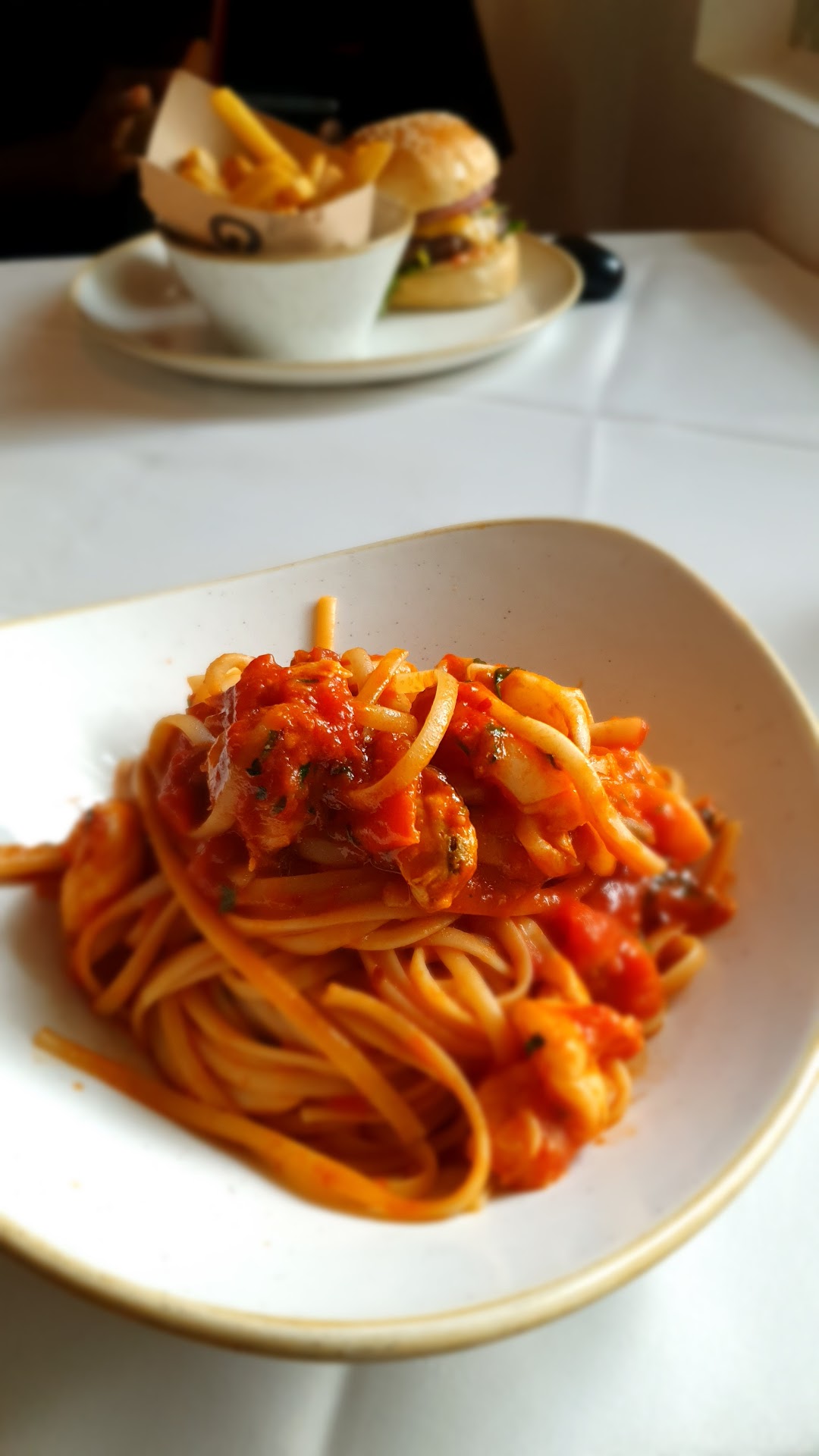 Paella rice was about 25k and I shouted 🤣 but oh well. 😅 I ended up with the luiguine pasta with sea food and tomato sauce. The person I went with, ordered a burger. The burger was about 12k or so and same for the pasta.